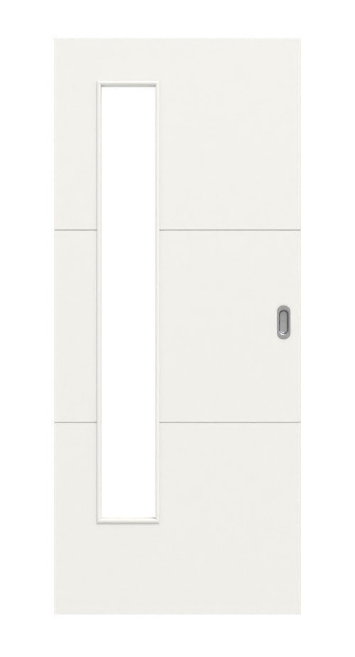 W lakierowanym na biało skrzydle drzwiowym wyfrezowano dwa poziome frezowania . Przejrzystość i otwartość zapewnia wąskie przeszklenie po stronie zawiasów.