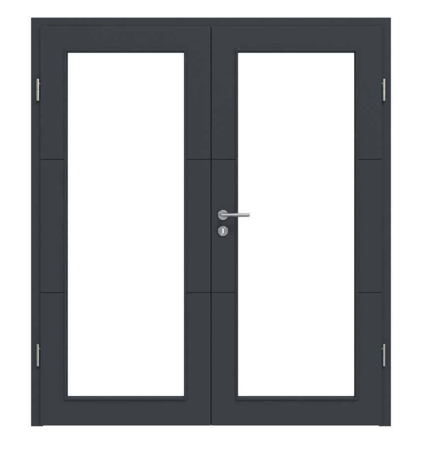 W lakierowanych na kolor antracytowy skrzydłach drzwiowych umieszczono poziome frezowania . Duże wycięcia na szyby zapewniają doskonałe doświetlenie wnętrza.