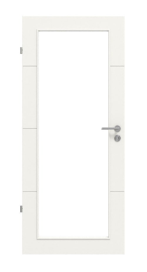 Cztery prostokątne segmenty powstają dzięki trzem poziomym szczelinom na skrzydle drzwi. Wysokiej jakości biała lakierowana powierzchnia zapewnia nowoczesny i estetyczny wygląd, który pasuje do każdego wnętrza. W skrzydle drzwi znajduje się duże przeszklenie.