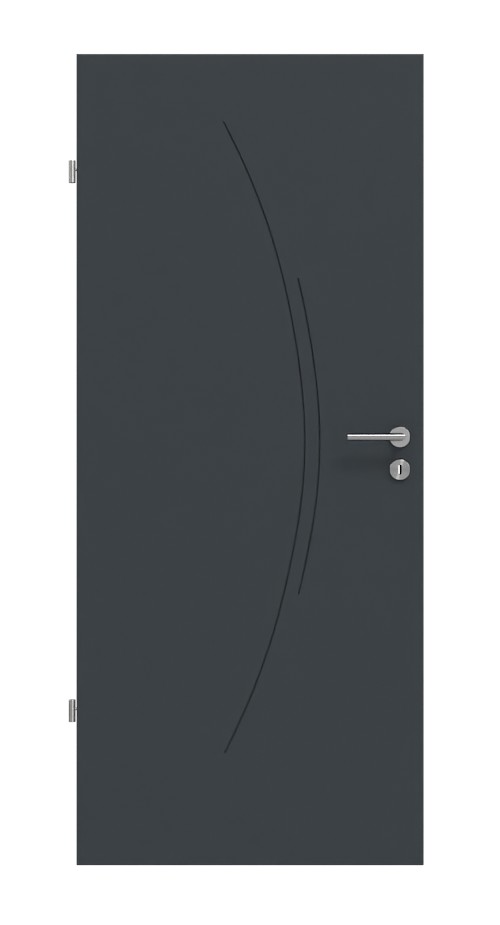 Dwie zakrzywione fugiwyfrezowane pośrodku skrzydła drzwiowego nadają modelowi indywidualny i estetyczny wygląd. Lakier w kolorze antracytowym podkreśla ekskluzyjne wykończenie wizualne.