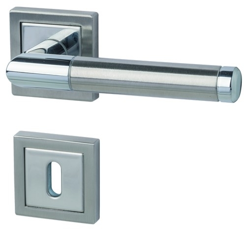 Nowoczesny i elegancki, model ten wyróżnia się przede wszystkim interesującymi kontrastami formy i materiału. Kwadratowe rosety oraz cylindryczny uchwyt tworzą udany mix elementów ze stali nierdzewnej i chromu. Trwała pozioma pozycja klamki jest zapewniona dzięki wbudowanej sprężynie podtrzymującej.