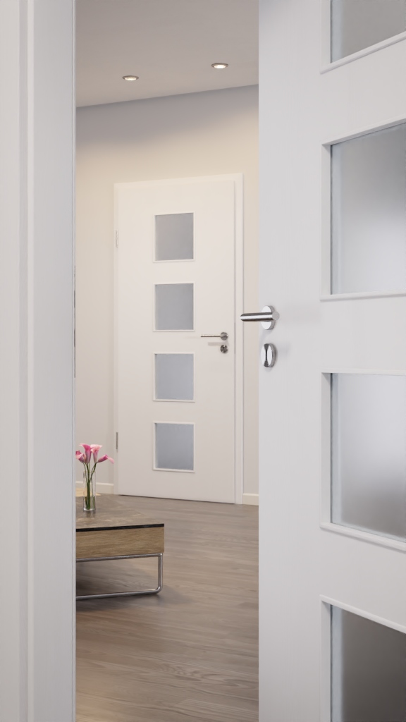 Szczególną uwagę przykuwa otwór świetlny w drzwiach. Dzięki niemu pomieszczenie wydaje się optycznie większe. Oprócz nowoczesnych rodzajów szkła, takich jak Mastercarree lub satynowane, dostępne są również klasyczne warianty, takie jak szkło przezroczyste. Niezbędną wytrzymałość zapewnia rama z twardego drewna.