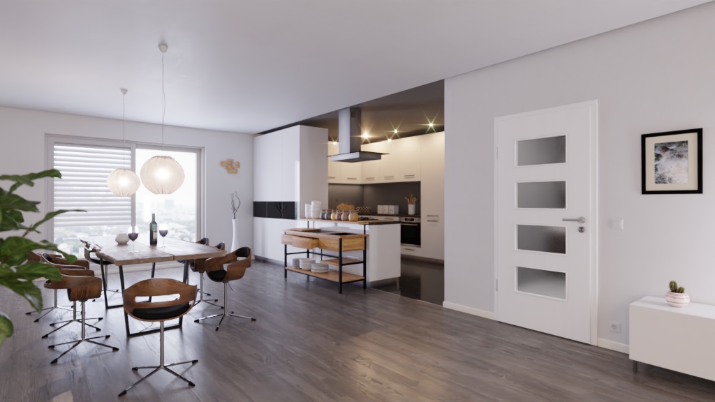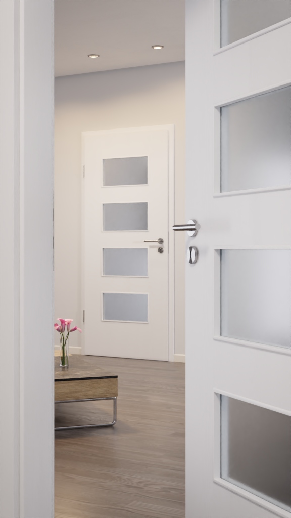 Cechą szczególną drzwi jest przeszklenie, które zapewnia wrażenie otwartego wnętrza. W zakresie szkła istnieje możliwość wyboru między klasycznymi rozwiązaniami, takimi jak szkło przezroczyste, a nowoczesnymi wariantami szkła. Wewnątrz znajduje się ramiak z twardego drewna, który zapewnia niezbędną stabilność.