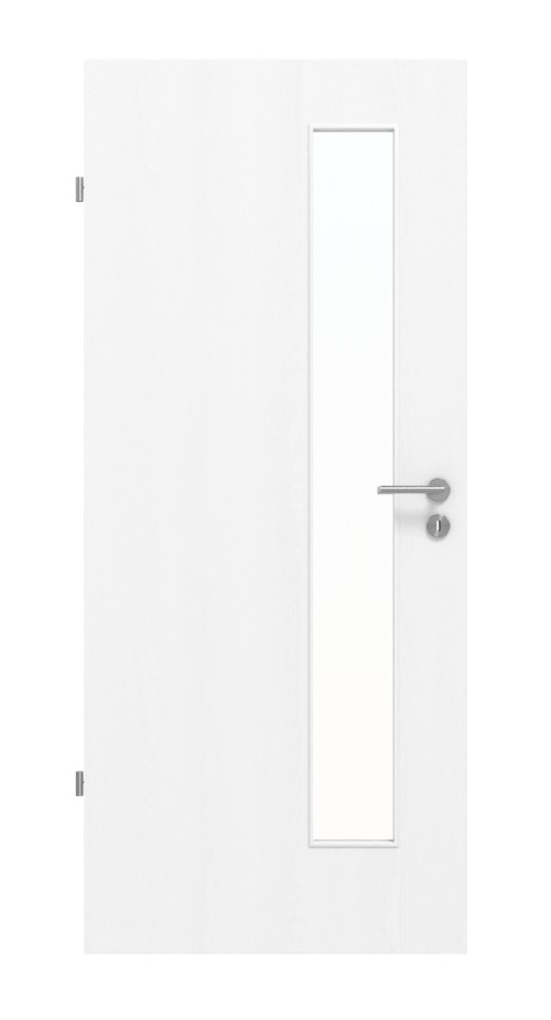 Idealnie dopasowane drewniane drzwi z otworem świetlnym: Drzwi Jeld-Wen z serii Optima mają wyczuwalną strukturę drewna w kolorze jesion aksamitny biały i łączą w sobie wycięcie na szybę z wytrzymałą powierzchnią.