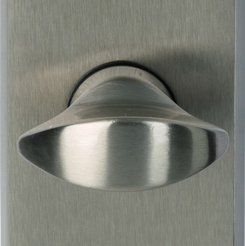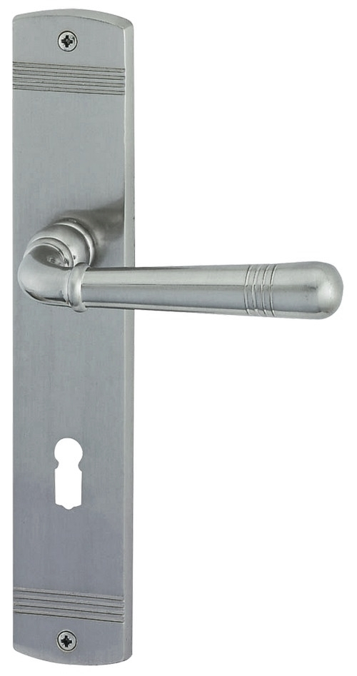 Z metalicznie stalowym połyskiem i delikatnymi zdobieniami garnitura stylowo prezentuje się na Twoich drzwiach. Zarówno widocznie przykręcana płyta, jak i klamka są ozdobione wąskimi, frezowanymi liniami. Za trwałe poziome osadzenie klamki odpowiada zintegrowana sprężyna podtrzymująca.