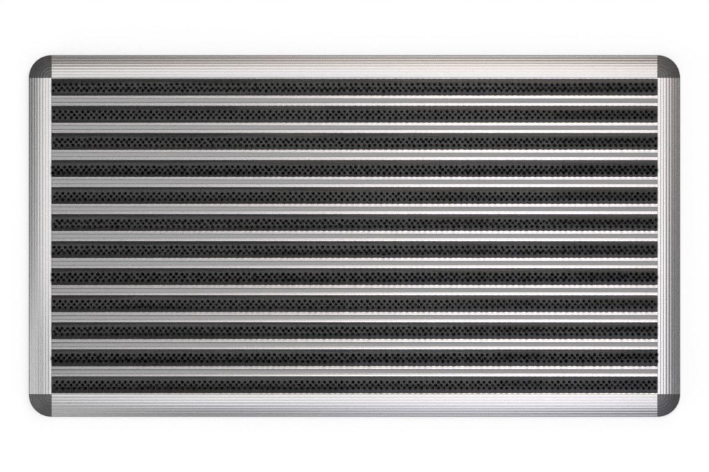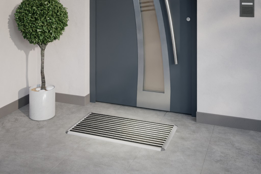 Aby zapobiec niechcianemu potknięciu, profile aluminiowe otoczone są srebrną ramą startową. Dzięki płaskiej konstrukcji możesz również korzystać z maty na wózku inwalidzkim.