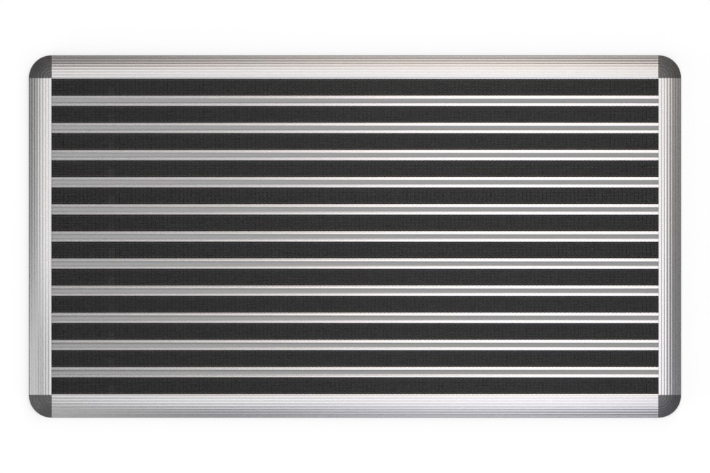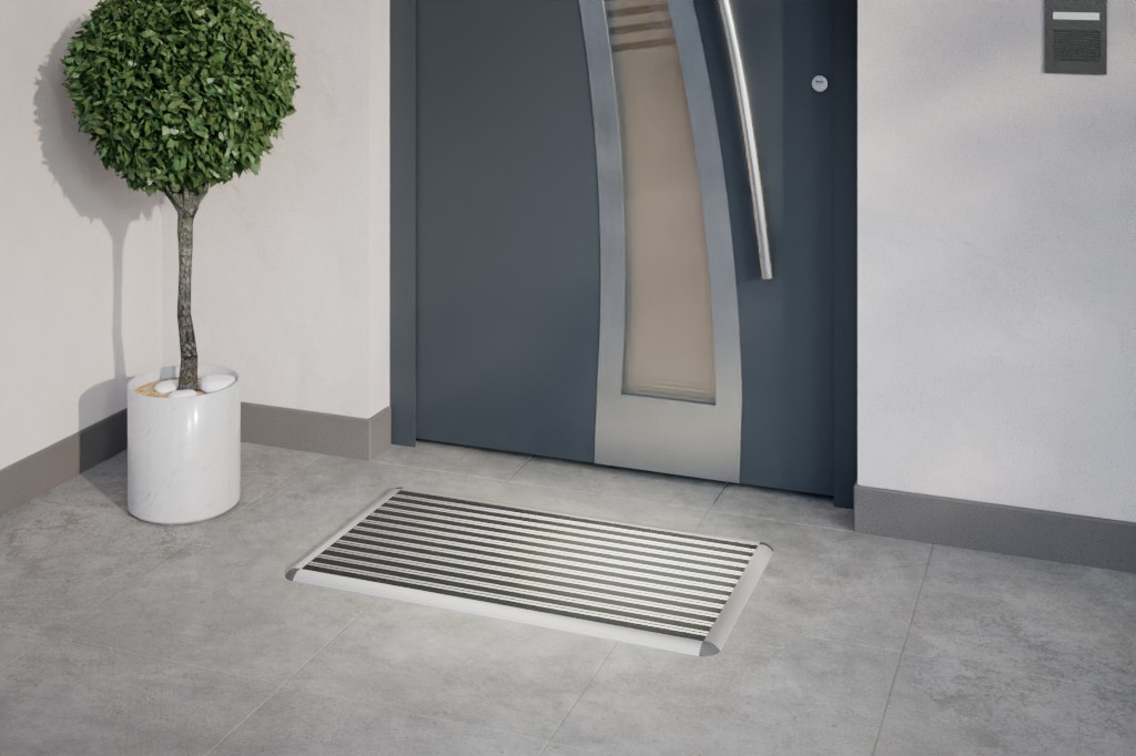 Aby zapobiec niechcianemu potknięciu, profile aluminiowe są otoczone srebrną ramą startową. Dzięki płaskiej konstrukcji możesz również korzystać z maty na wózku inwalidzkim.