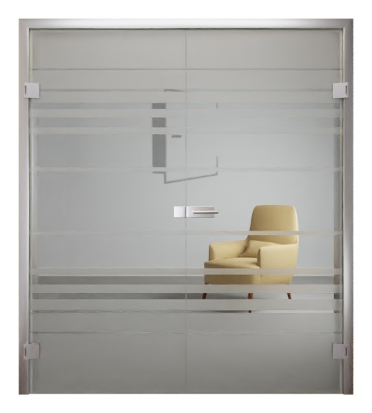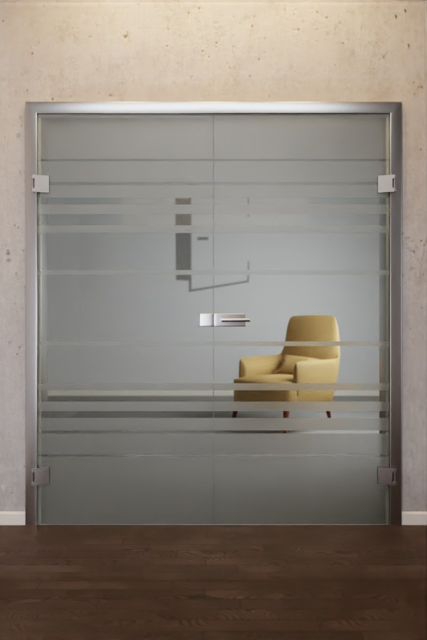 Design tych wysokiej jakości drzwi całkowicie szklanych charakteryzuje się prostym, ale efektownym motywem belek. Szerokie poprzeczki harmonijnie otaczają klamkę drzwiową. W kierunku satynowanej górnej i dolnej krawędzi stają się one coraz drobniejsze, tworząc ekskluzywny efekt końcowy.