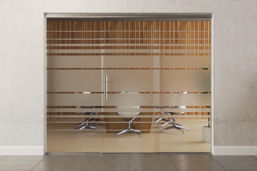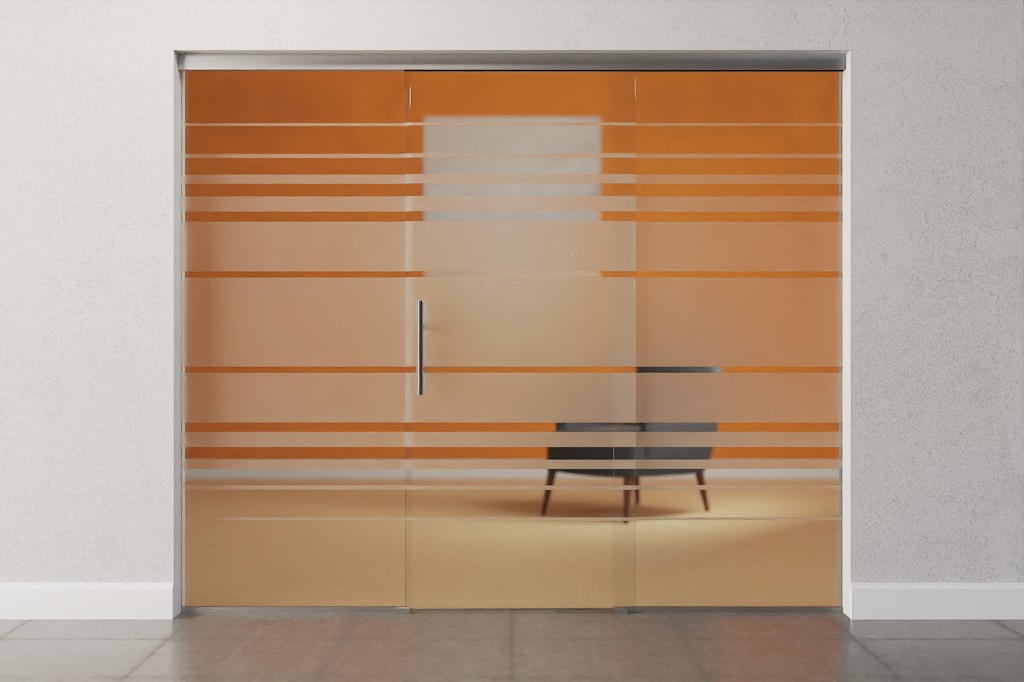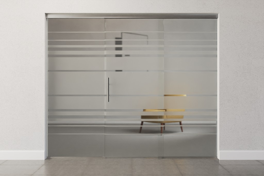 Szerokie, poziome pasy biegną pośrodku przezroczystej szyby, zapewniając dyskretną osłonę przed wzrokiem. U góry i u dołu towarzyszą im węższe poziome paski , które delikatnie nawiązują do motywu.