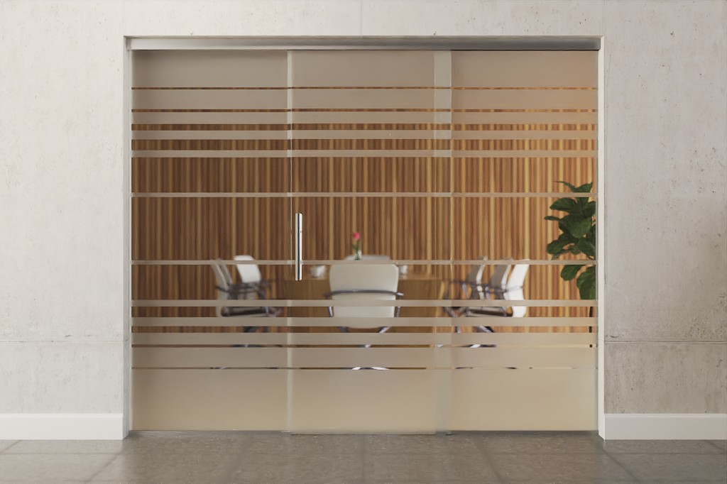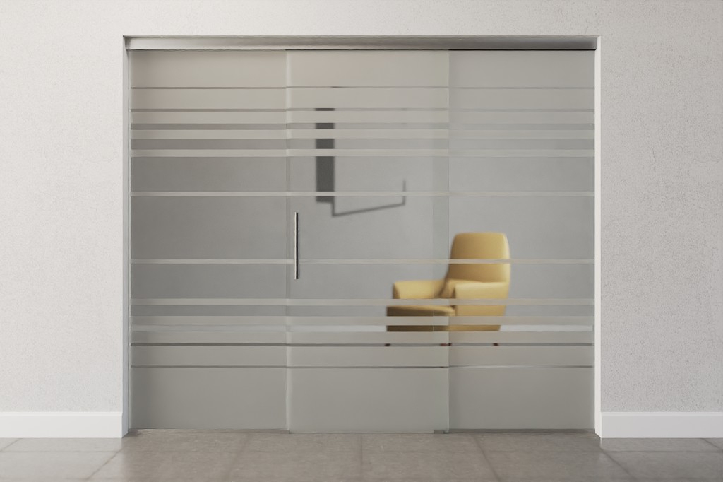 Całkowita szerokość zabudowy całoszklanej rozkłada się równomiernie na skrzydło drzwiowe i elementy boczne, dzięki czemu powstaje symetryczne wykończenie wizualne.