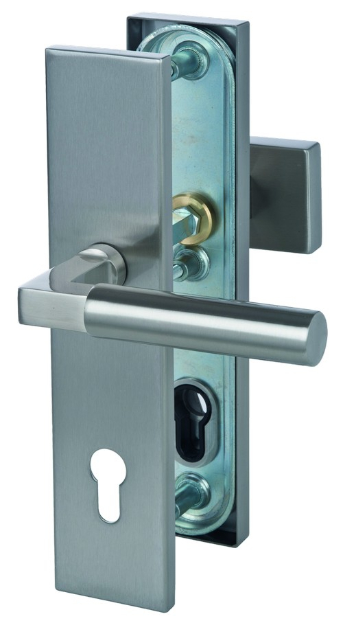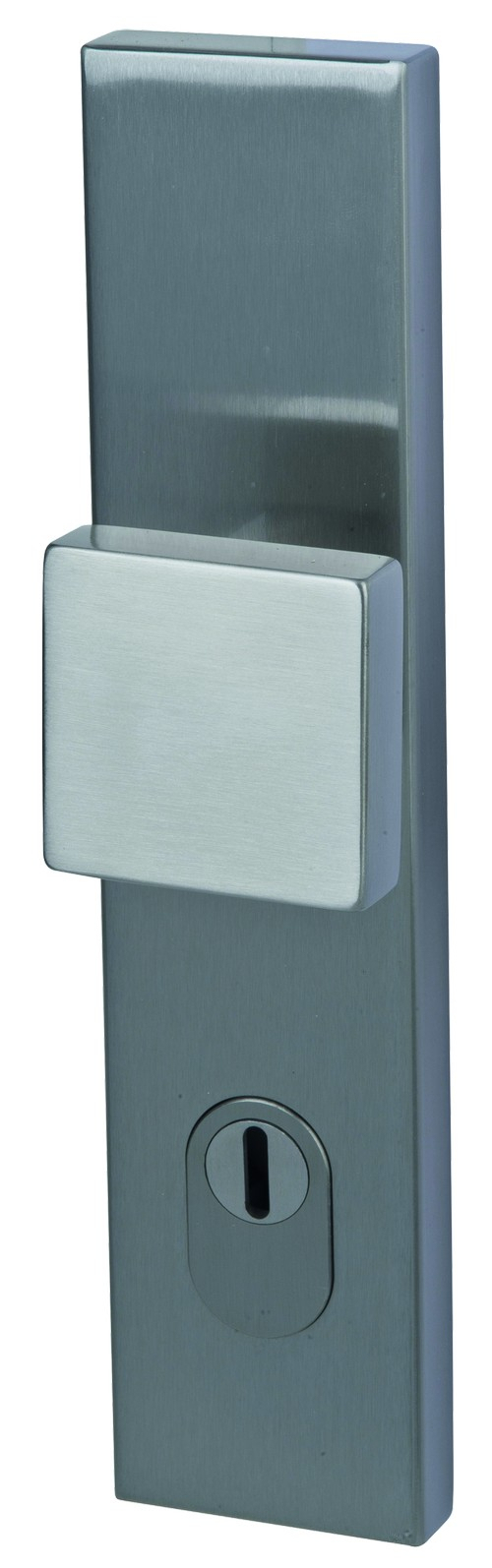 Model z matowej stali nierdzewnej dostępny jest w wersji klamka/płyta uchwytowa (stała) lub klamka/klamka. Cylindryczny uchwyt stanowi piękny kontrast do prostokątnej tarczy i kwadratowej, lekko przesuniętej płyty uchwytowej.