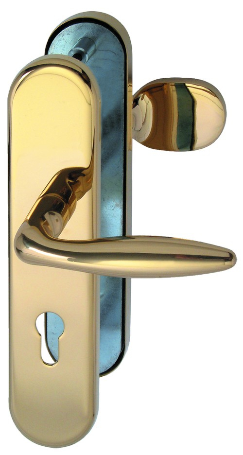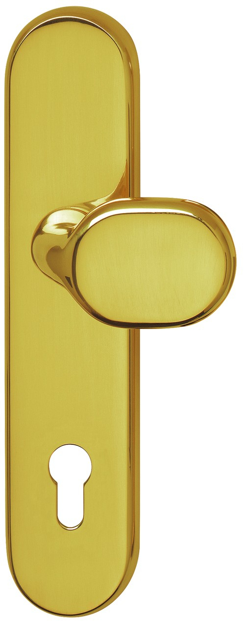 Elegancki model w złotym, błyszczącym Robusta wyróżnia się zaokrąglonym uchwytem. Z drugiej strony długiej tarczy znajduje się opcjonalnie płaska płyta uchwytowa lub drugi uchwyt.
