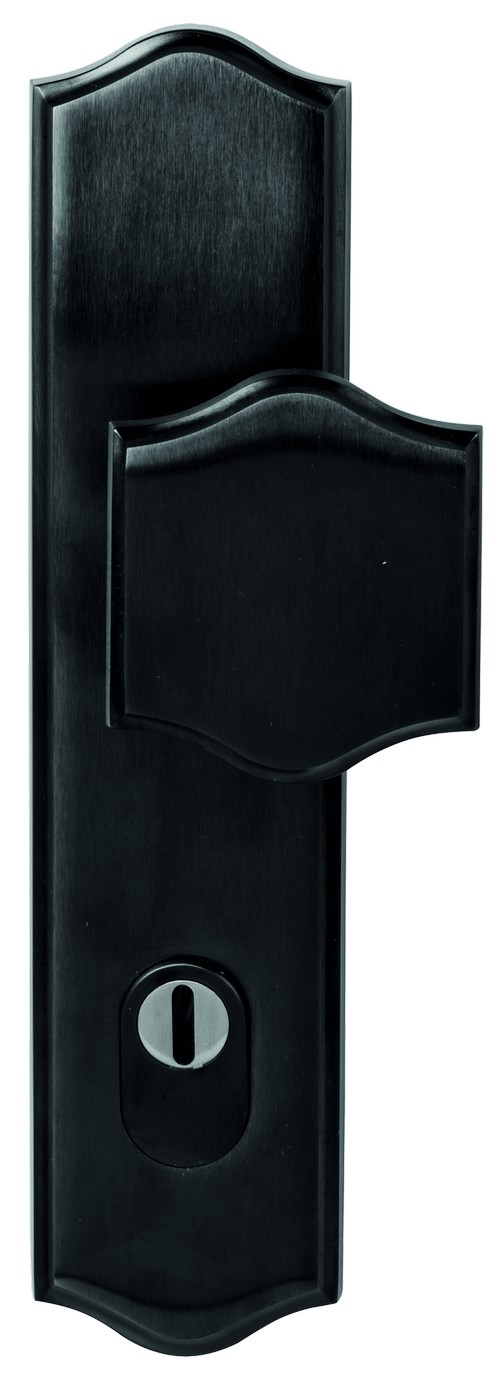Urokliwe detale i czarny satynowy wykończenie sprawiają, że model jest prawdziwą ozdobą! Dostępny jest w wersjach klamka/płyta chwytowa (stała) lub klamka/klamka. Płyta chwytowa i długie osłony mają lekko zakrzywiony kształt, a klamka ozdobiona jest okrągłymi detalami.