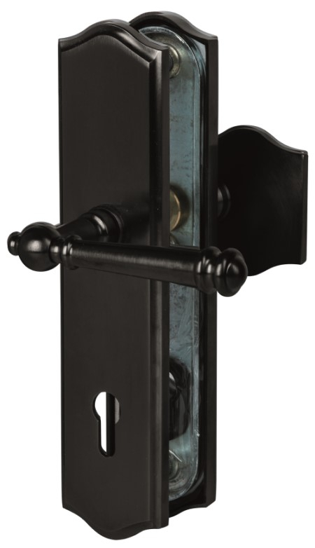 Czarny satynowany mosiądz i urokliwe zdobienia na długiej tarczy i klamce nadają modelowi rustykalny urok. Masz do wyboru wersje klamka/klamka oraz klamka/stacjonarna płyta uchwytowa.