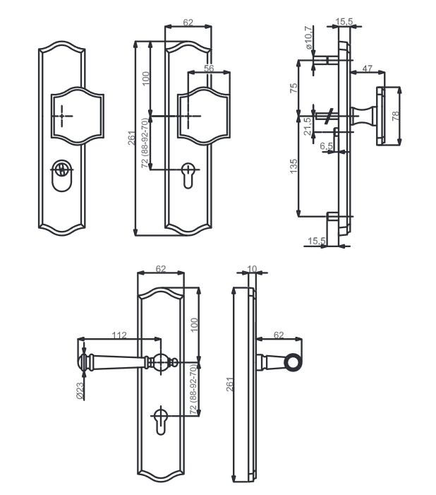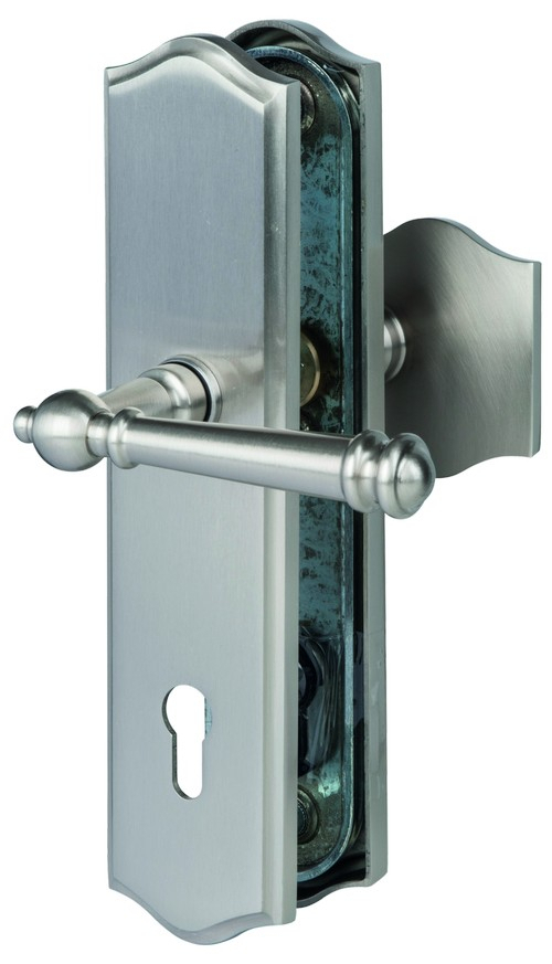 Dzięki starannym detalom matowa, stalowoszara armatura emanuje historycznym urokiem. Długi szyld jest ograniczony delikatnymi łukami, a okrągłe zdobienia nadają klamce niepowtarzalny charakter. Zamiast klamki możesz również wybrać stałą płytę uchwytową na zewnątrz.