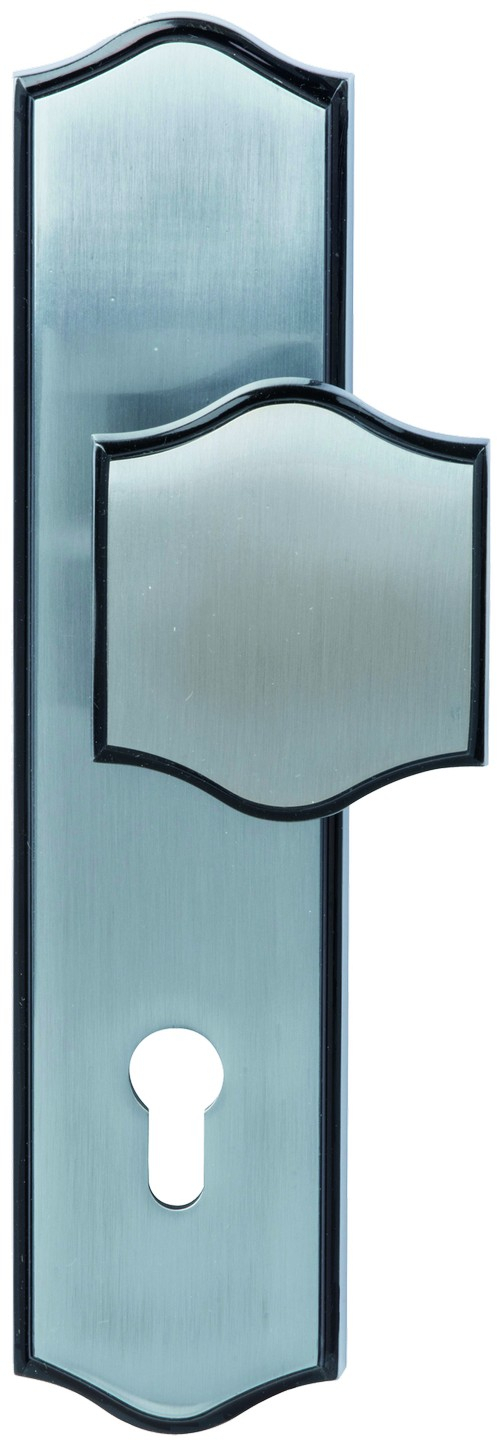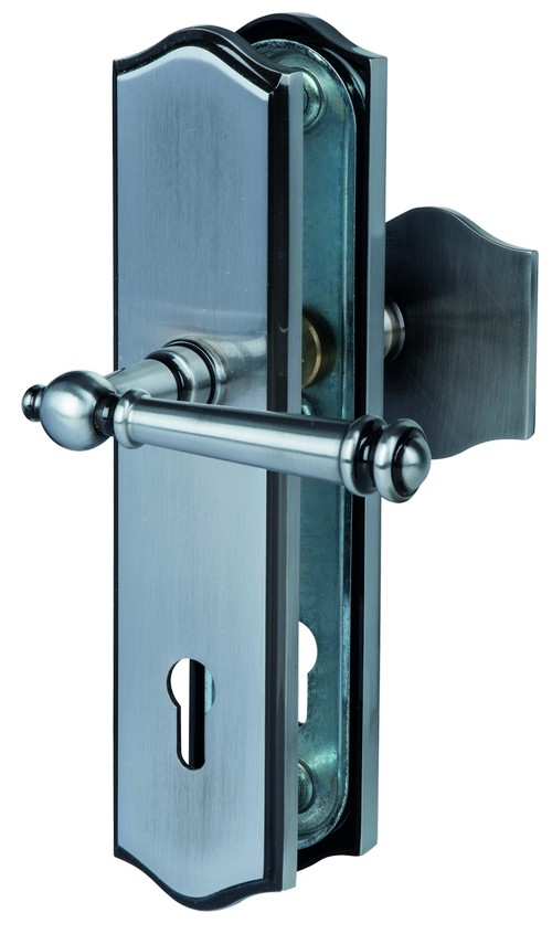 W swojej historycznej estetyce stalowoszary, satynowany zestaw szybko przyciąga wzrok. Faliste kształty zdobią długą tarczę i klamkę. Na zewnętrzną stronę drzwi wejściowych do mieszkania można wybrać między stałą, falistą płytą uchwytową a klamką.