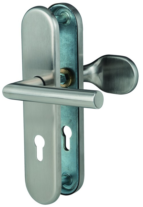 Owalna płyta uchwytu i prosta klamka harmonijnie się uzupełniają w tym zestawie z matowej stali nierdzewnej. Alternatywnie zamiast płyty uchwytu można wybrać wersję z drugą klamką. Model z długim szyldem jest przetestowany pod kątem ochrony przeciwpożarowej i dodatkowo chroniony dzięki zintegrowanej osłonie cylindra.