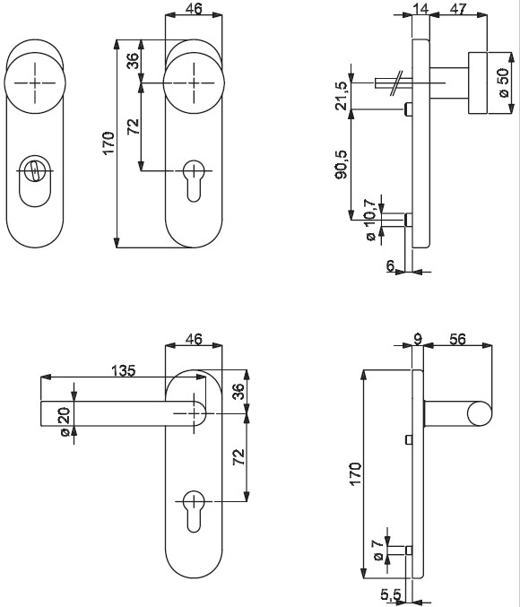 Model dostępny jest w wersji klamka-klamka lub klamka-gałka. Po obu stronach drzwi znajduje się owalna rozeta krótka, wyposażona w zamek PZ. Gałka jest płaska i okrągła. Klamka natomiast jest okrągła, w kształcie litery L i kończy się płaską krawędzią.