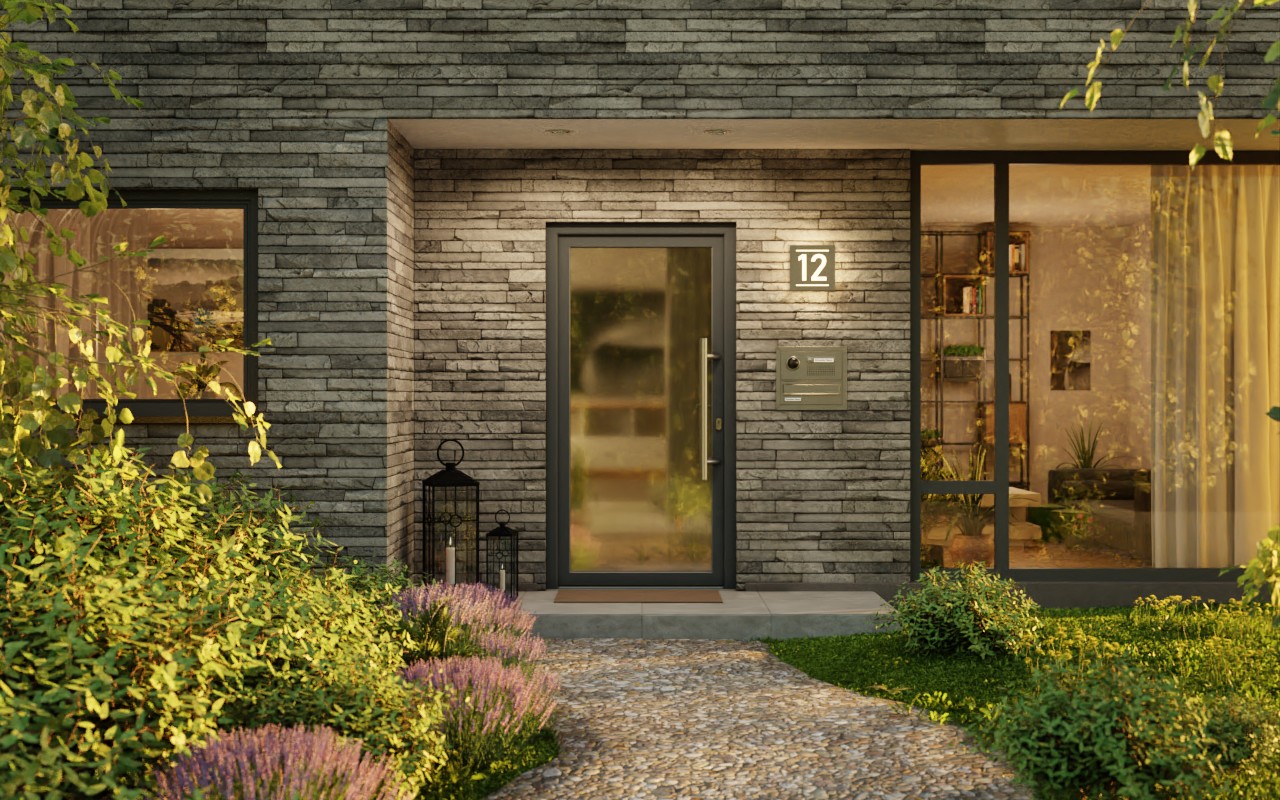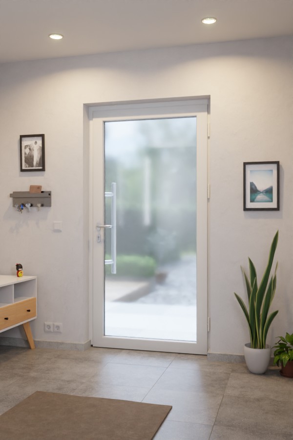 • Zakres dostawy: Drzwi wejściowe z ramą, zawiasami, zamkiem, zabezpieczeniem przed podważeniem i progiem, dodatkowe elementy do skonfigurowania.