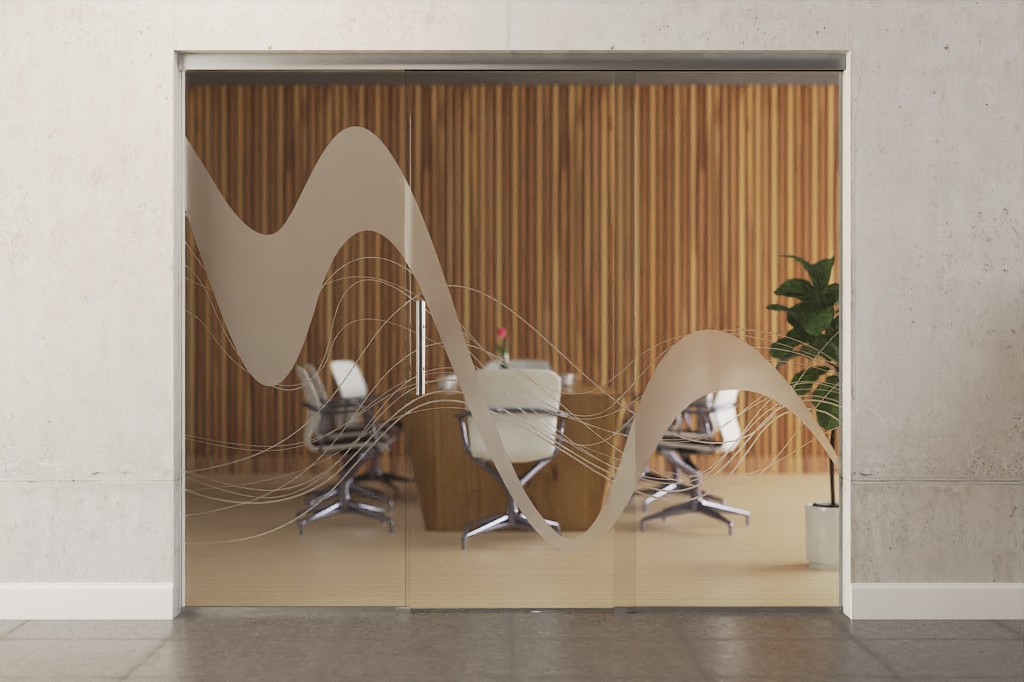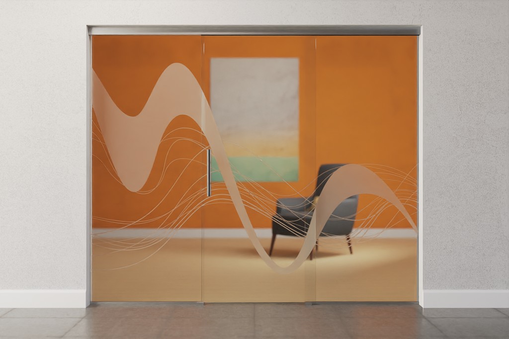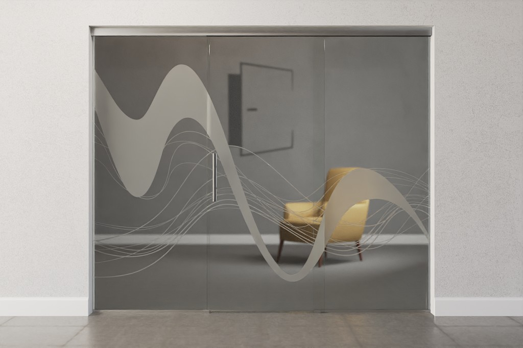 Całkowita szerokość zabudowy całoszklanej rozkłada się równomiernie na skrzydło drzwiowe i elementy boczne, dzięki czemu powstaje symetryczne wykończenie wizualne.