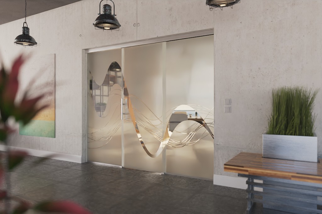 Całkowita szerokość zabudowy całoszklanej rozkłada się równomiernie na skrzydło drzwiowe i elementy boczne, dzięki czemu powstaje symetryczne wykończenie wizualne.