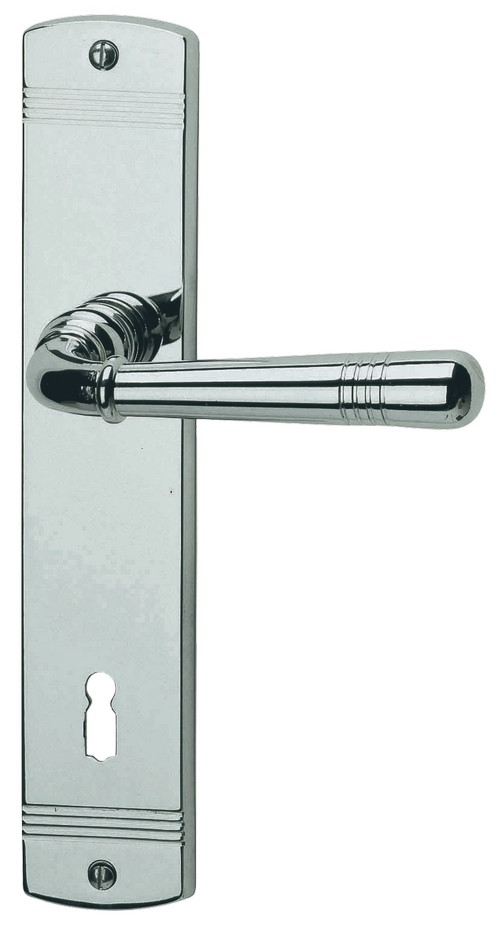 Polerowany chrom zamienia widocznie przykręconą długą gałkę w przyciągający wzrok element Twoich drzwi. Delikatne linie biegną wzdłuż tarczy i klamki. Zewnętrzna strona modelu jest zakończona okrągłym przyciskiem. Idealna pozycja klamki drzwiowej jest zapewniona przez zintegrowaną sprężynę podtrzymującą.