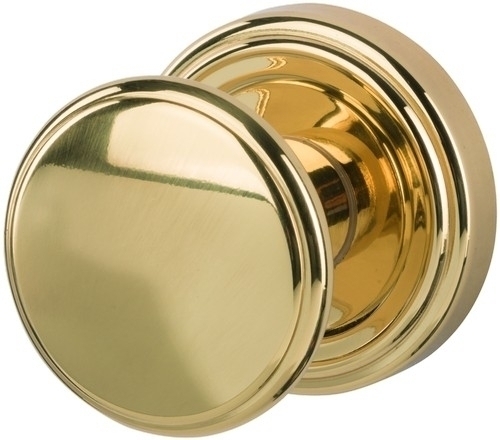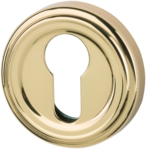 Polerowany mosiądz i piękne zdobienia definiują styl atestowanego pod względem ochrony przeciwpożarowej okuć. Na okrągłych rozetach wznoszą się delikatne pierścienie, a w klamce wyryto cztery subtelne rowki. Wbudowana sprężyna powrotna niezawodnie przywraca klamkę do poziomej pozycji.