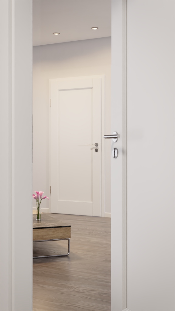 Dzięki płycie wiórowej z rdzeniem drzwiowym skrzydło drzwiowe jest odporne na codzienne obciążenia. W zestawie znajdują się dwa 3-częściowe paski oraz zamek z kluczem płaskim Flüstercomfort.