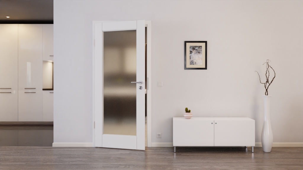 W zamontowanej ramie znajduje się wycięcie na szybę, które stanowi większą część skrzydła drzwiowego. Świeża powierzchnia pokryta białą farbą podkreśla nowoczesny wygląd.