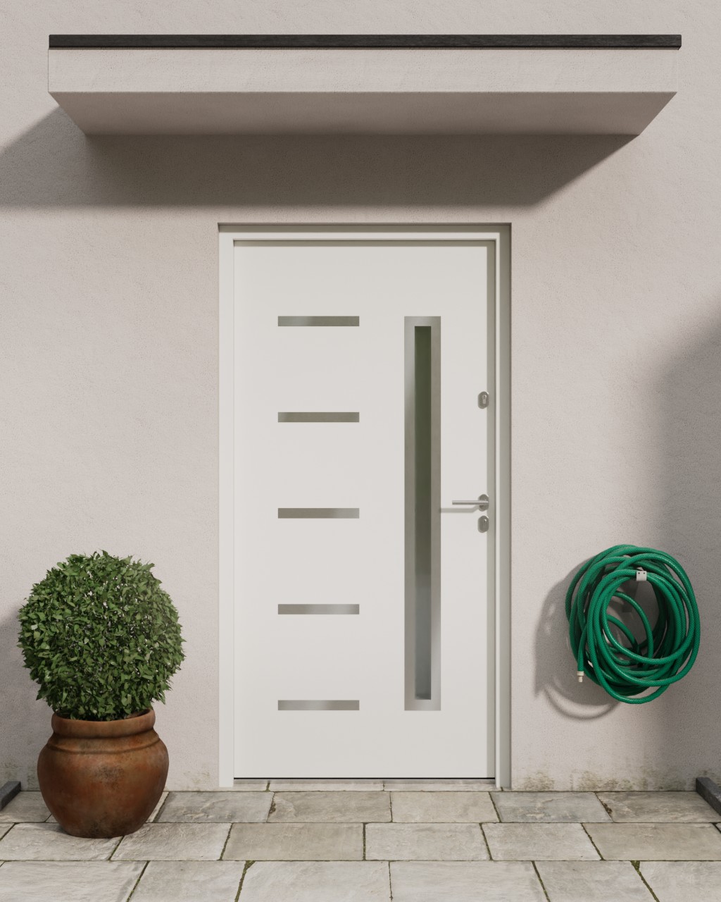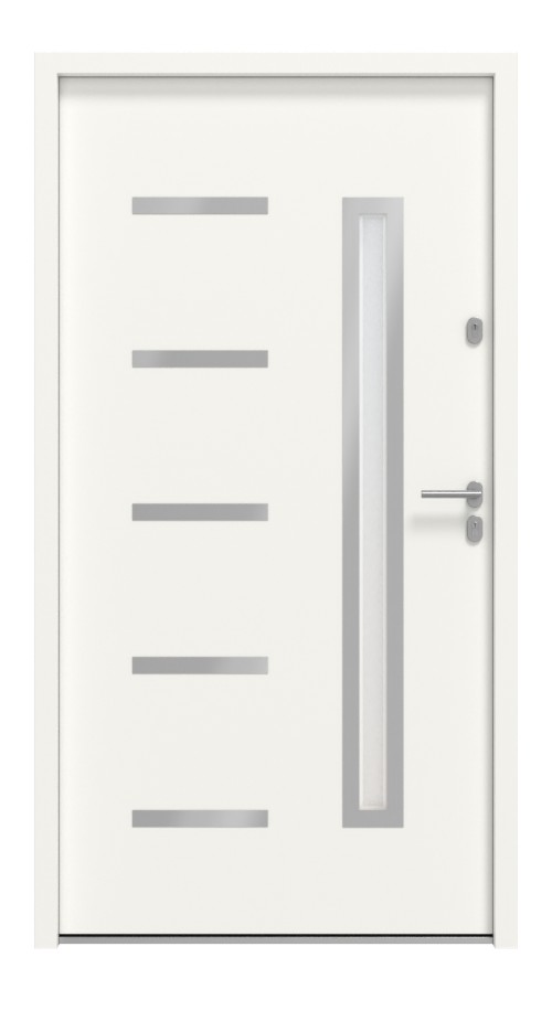 Wygląd skrzydła drzwiowego najlepiej można opisać jako prostoliniowy, kompaktowy i pozbawiony zbędnych ozdób. Oprócz wąskiego, prostokątnego przeszklenia zapewnia to prosta rama szklana ze stali nierdzewnej oraz pięć poziomych pasków wykonanych z tego samego materiału po stronie zawiasów.