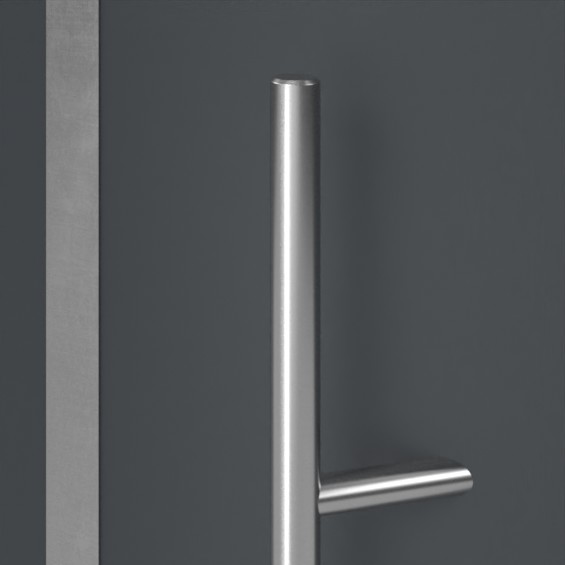 Na całej wysokości skrzydła drzwiowego, obustronnie pokrywającego skrzydło, znajduje się prosty pasek ze stali nierdzewnej, który nadaje modelowi wygląd strukturyzowany. Dwa uchwyty w kształcie litery L z owalnymi rozetami, które są standardowym elementem wyposażenia, idealnie wpisują się w prostą koncepcję całości i nadają drzwiom stylowy wygląd.