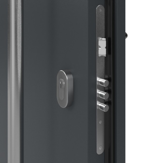 Wyposażenie zabezpieczające drzwi wejściowe obejmuje dwa niezależne zamki z ryglowaniem ryglem oraz cylindry profilowe z kluczem uniwersalnym, a także trzy regulowane zawiasy. Zabezpieczenia przed wyważeniem po stronie zawiasowej zwiększają wytrzymałość skrzydła drzwiowego i utrudniają wyważenie go z ościeżnicy.