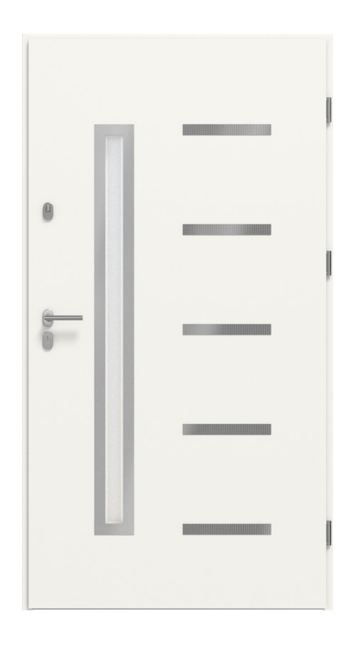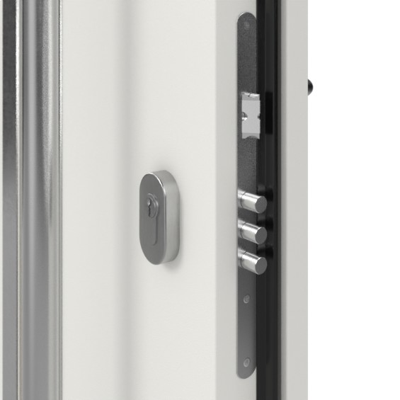 Wyposażenie zabezpieczające drzwi wejściowe składa się z dwóch niezależnych zamków z ryglowaniem sworzniowym, cylindrów profilowych z kluczem uniwersalnym oraz trzech regulowanych zawiasów. Dodatkowe zabezpieczenia przed wyważeniem w obszarze zawiasów utrudniają wyważenie skrzydła drzwiowego z ościeżnicy, zapewniając tym samym większą wytrzymałość i odporność drzwi.
