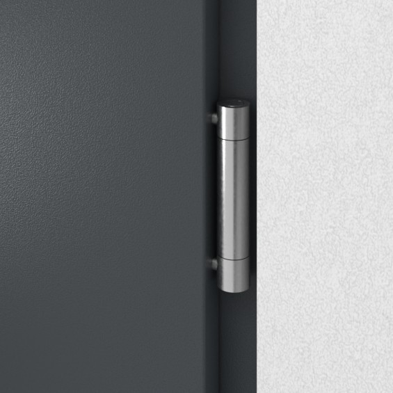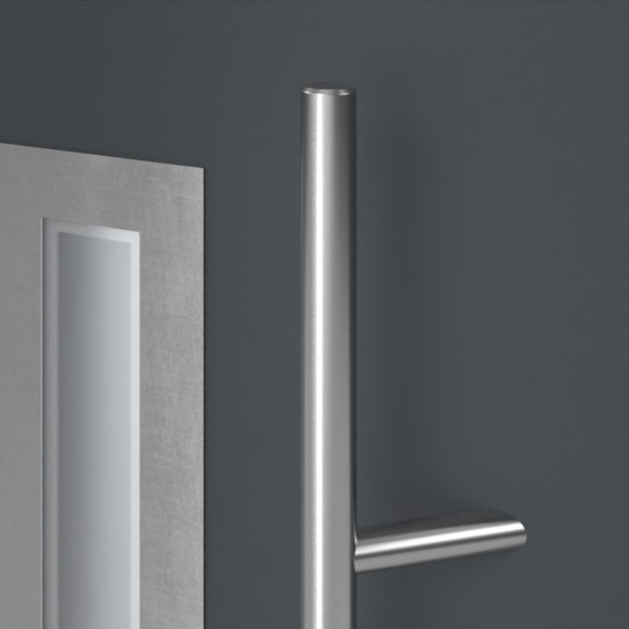 Pięć pasków ze stali nierdzewnej umieszczonych po stronie zawiasów tworzy elegancką jednostkę z prostoliniową aplikacją ze stali nierdzewnej, która otacza mleczne wycięcie na szybę z wąską ramką. Ich prosta forma znajduje również odzwierciedlenie w dostarczonych okuciach, które w standardzie składają się z dwóch klamek L i owalnych rozet.