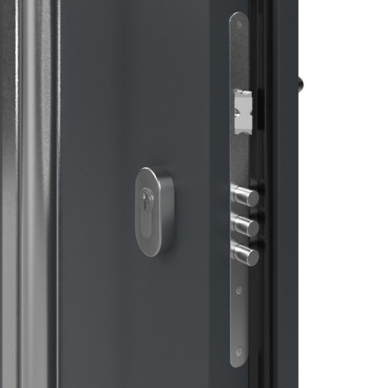 Wyposażenie zabezpieczające drzwi wejściowe składa się z dwóch niezależnych zamków z ryglowaniem sworzniowym, cylindrów profilowych z kluczem uniwersalnym oraz trzech regulowanych zawiasów. Dodatkowe zabezpieczenia przed wyważeniem w obszarze zawiasów utrudniają wyważenie skrzydła drzwiowego z ościeżnicy, zapewniając tym samym większą wytrzymałość i odporność drzwi.