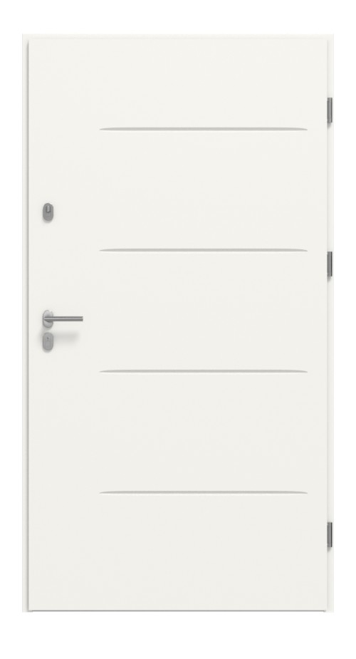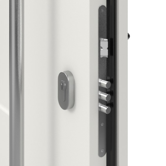 Wyposażenie zabezpieczające drzwi wejściowe składa się z dwóch niezależnych zamków z ryglowaniem ryglem, regulowanych zawiasów oraz zamków profilowych z jednym kluczem wraz z pięcioma kluczami. Zabezpieczenia przed wyważeniem po stronie zawiasów zwiększają wytrzymałość skrzydła drzwiowego i utrudniają wyważenie go z ościeżnicy.