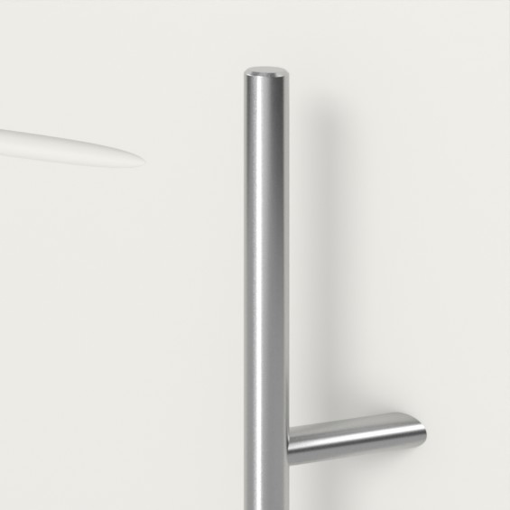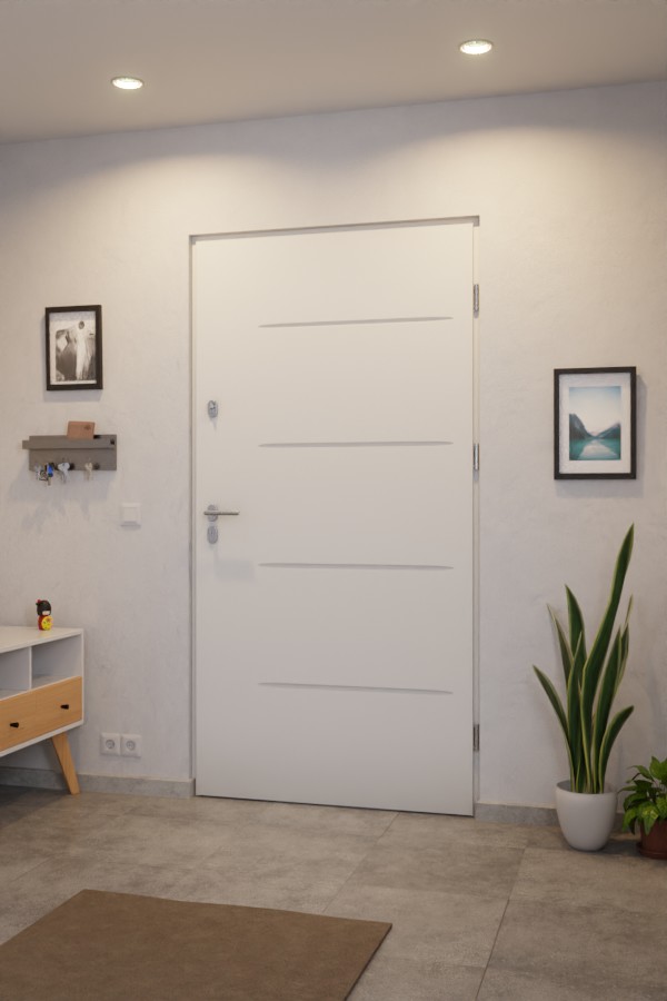 Cztery poziome frezowania zdobią środek skrzydła drzwiowego, które jest obustronnie pokrywającym skrzydło drzwi nakładkowych. Ich linearny styl harmonizuje z prostymi klamkami ze stali nierdzewnej, składającymi się z dwóch klamek w kształcie litery L i owalnych rozet, które wchodzą w skład standardowego wyposażenia modelu.