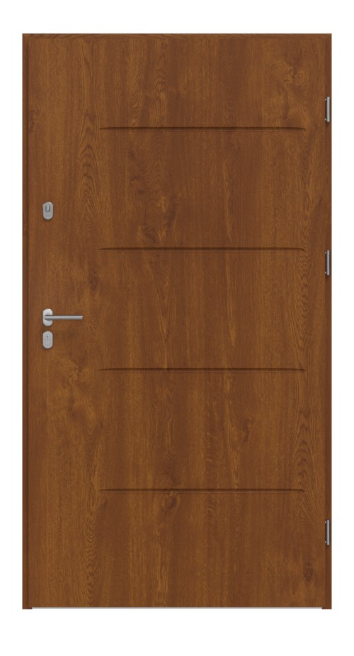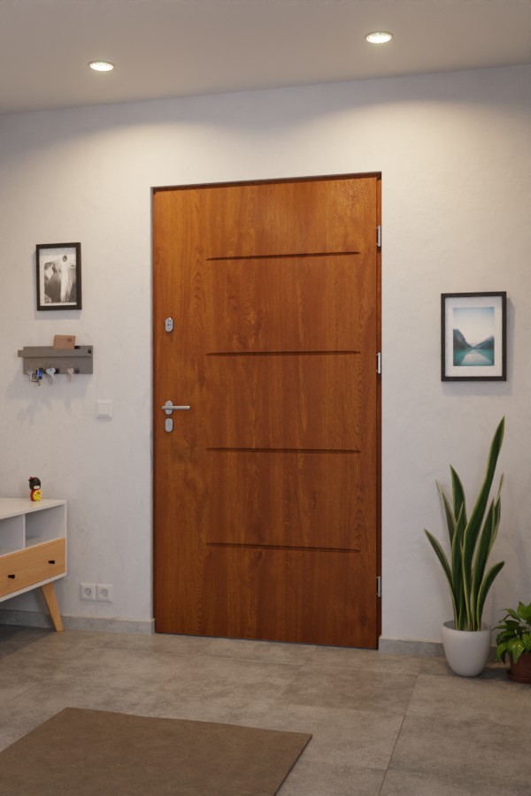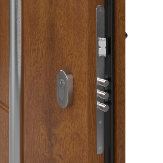 Wyposażenie zabezpieczające drzwi wejściowe składa się z dwóch niezależnych zamków z ryglowaniem ryglem, regulowanych zawiasów oraz zamków profilowych z jednym kluczem wraz z pięcioma kluczami. Zabezpieczenia przed wyważeniem po stronie zawiasów zwiększają wytrzymałość skrzydła drzwiowego i utrudniają wyważenie go z ościeżnicy.