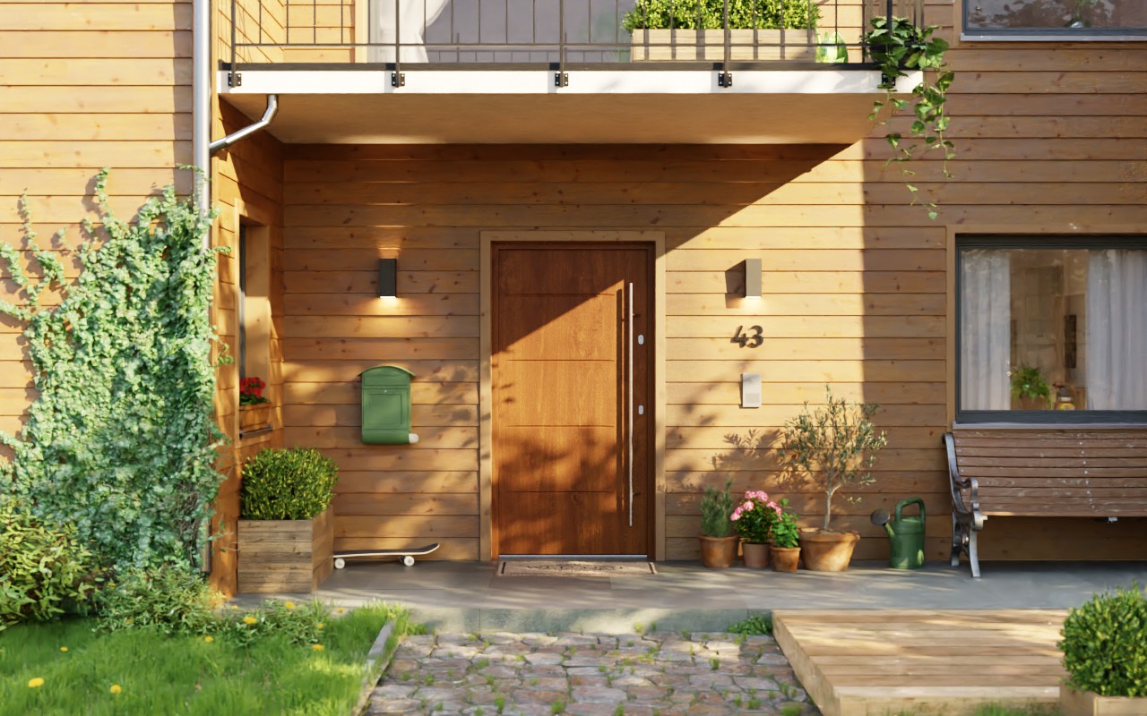 - Eleganckie drzwi wejściowe wykonane z wytrzymałej stali
