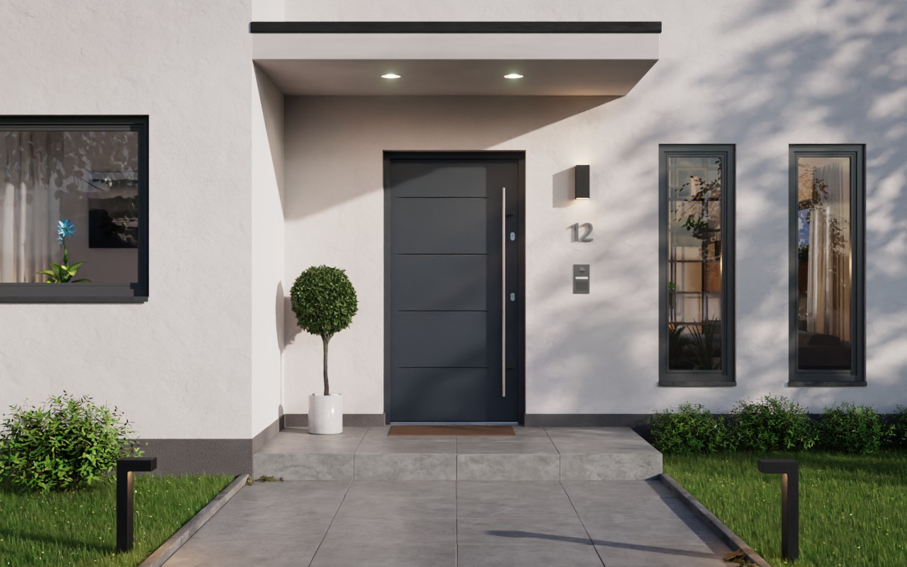 - Eleganckie drzwi wejściowe wykonane z wytrzymałej stali