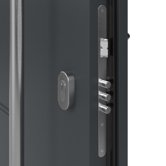 Wyposażenie zabezpieczające drzwi wejściowe składa się z dwóch niezależnych zamków z ryglowaniem ryglem, regulowanych zawiasów oraz zamków profilowych z jednym kluczem wraz z pięcioma kluczami. Zabezpieczenia przed wyważeniem po stronie zawiasów zwiększają wytrzymałość skrzydła drzwiowego i utrudniają wyważenie go z ościeżnicy.