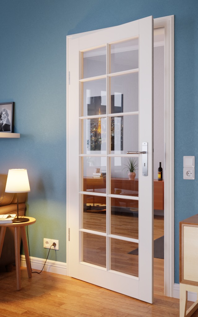 Wykonane z pełnego rdzenia, który zapewnia odpowiednie wsparcie, charakterystyczne jest szczególnie wysokiej jakości białe lakierowanie. Gwarantowane atrakcje tworzy przestronny otwór świetlny. Wąskie drewniane listwy w białym lakierze podkreślają całość skrzydła drzwi w sposób zabawny.