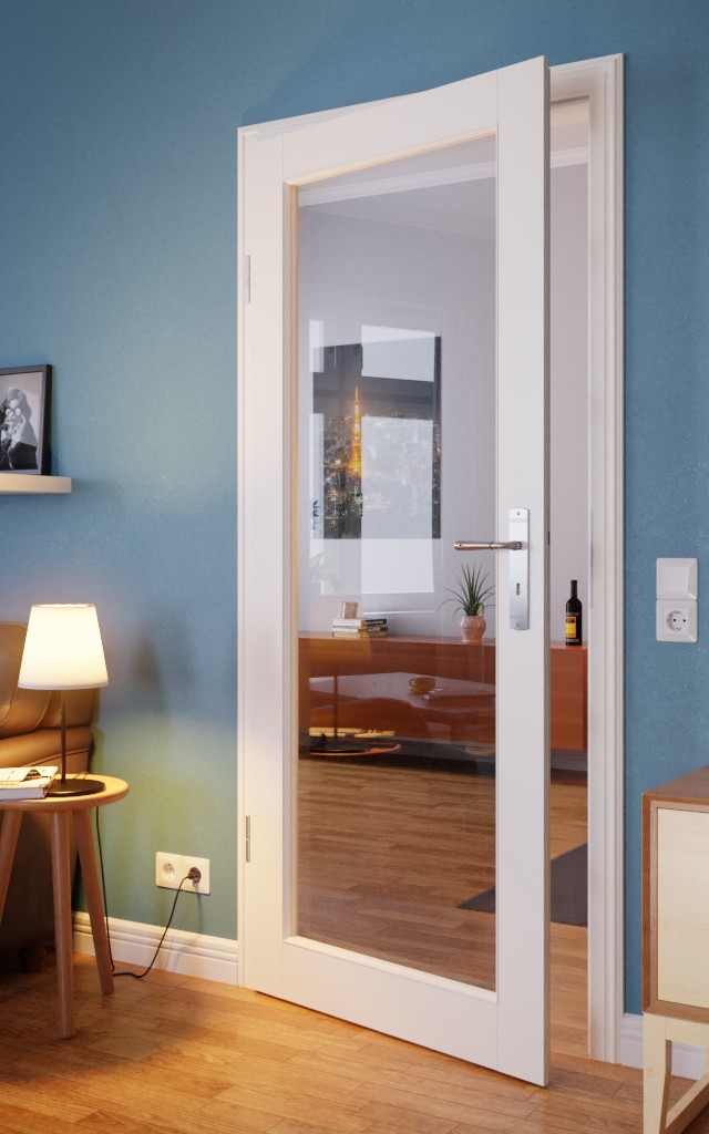 Wyposażone w wysokiej jakości białą lakierowaną powłokę, zapewniają odpowiednią stabilność dzięki pełnemu wypełnieniu wewnętrznemu. Szczególnym wyróżnikiem jest przestronne okno świetlne z nałożonymi listwami szklanymi, które elegancko otacza formowany sufit w stylu profilowanej listwy drzwiowej.