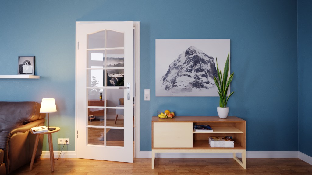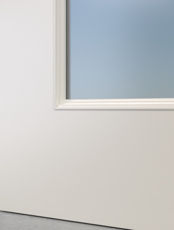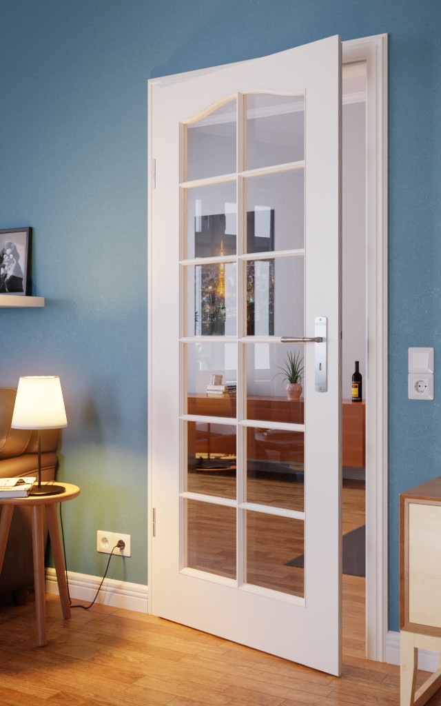 Model wykonany jest z pełnych rdzeni. Skrzydło drzwi pokryte jest wysokiej jakości białym lakierem. Design eleganckiego przeszklenia z nałożoną listwą szklaną jest szczególnie podkreślony przez wąskie, leżące na powierzchni drewniane listwy. Klasyczny wygląd ramy nadaje całości wykończenie.