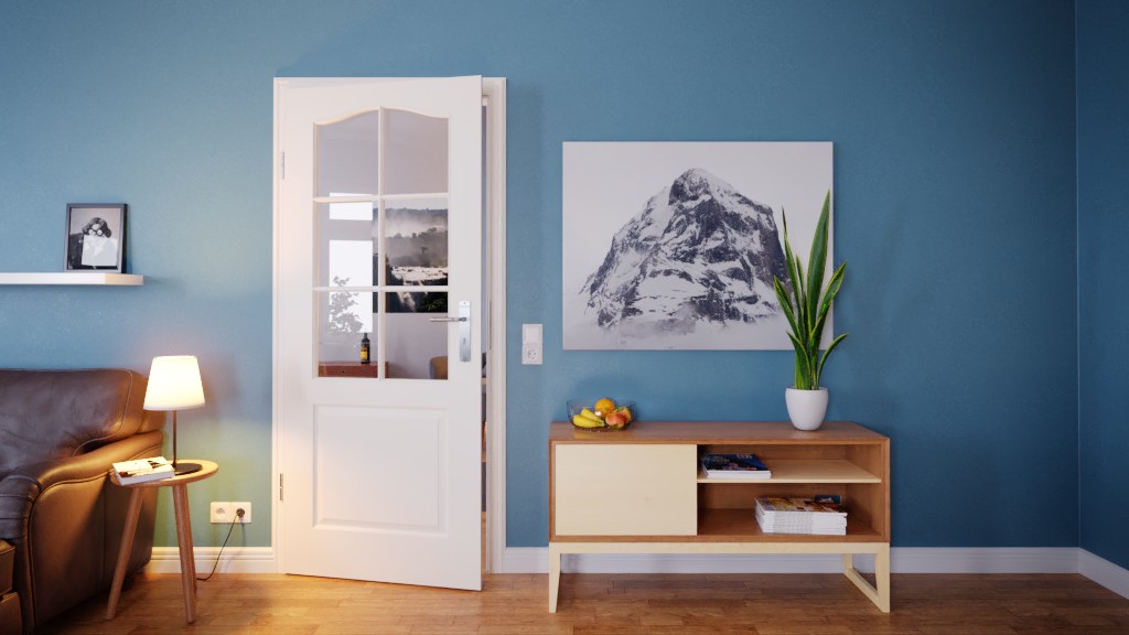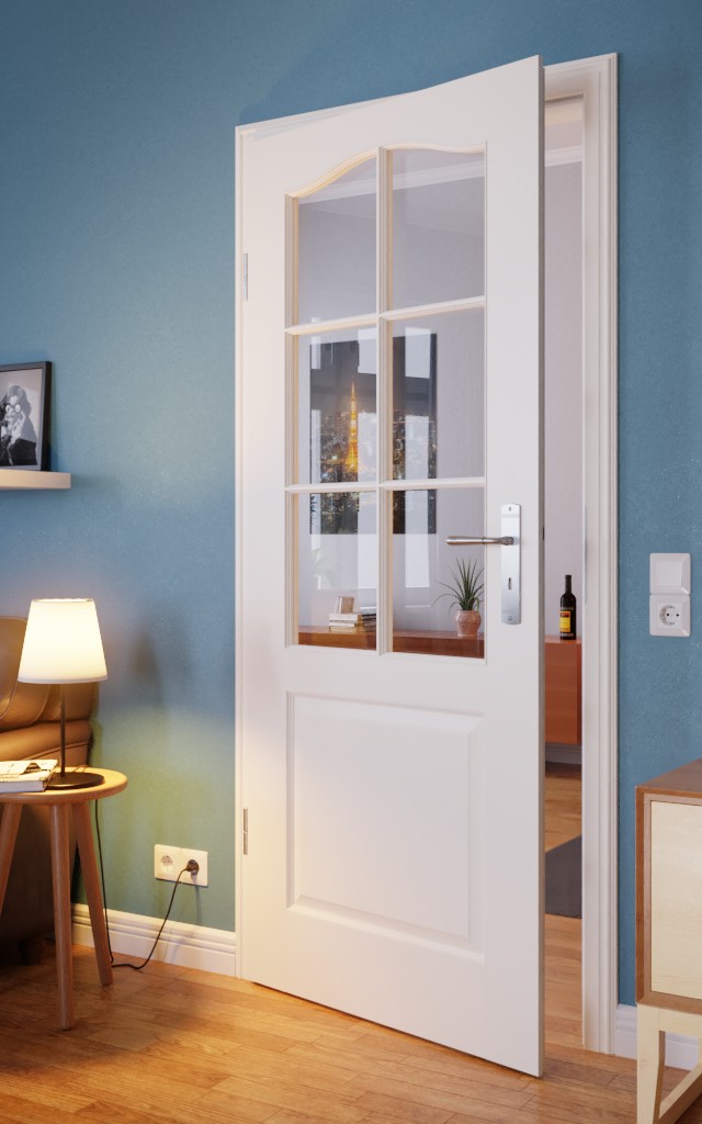 Model jest wykonany z pełnego rdzenia. Skrzydło drzwi pokryte jest wysokiej jakości białym lakierem. Harmonijna gra ponadczasowego designu i światła obiecuje przestronny szklany wstaw z nałożonymi listwami szklanymi, który jest szczególnie podkreślony przez nałożone drewniane listwy. Formowane pokrycie i łuk na górze nadają modelowi wyjątkowy charakter.