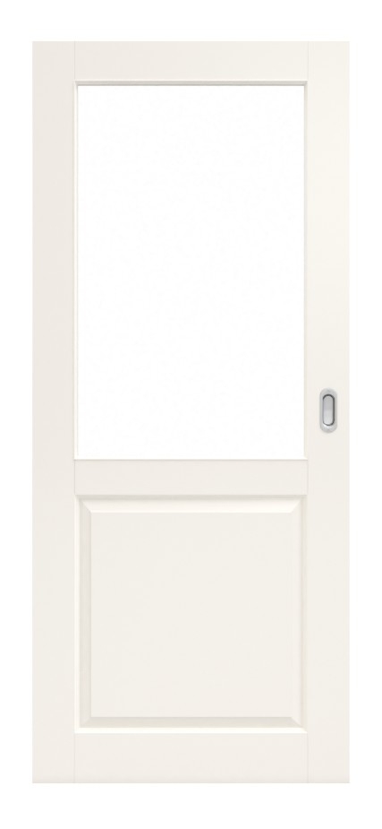 Skrzydło tych drzwi przesuwnych wizualnie dzieli się na dwie części. W górnej części znajduje się otwór świetlny, a dolna część jest zdobiona kwadratowym wypełnieniem drewnianym.