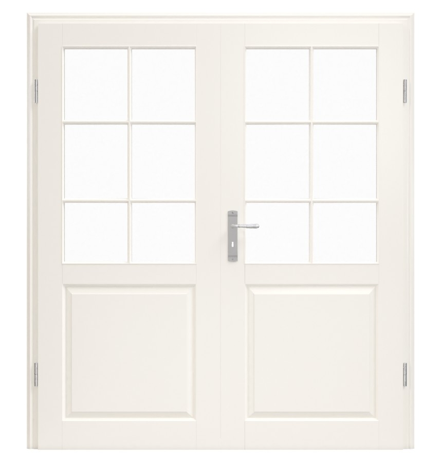 Te wysokiej jakości biała lakierowana podwójna drzwi serii Stiba Plus od Jeld-Wen (w kolorze podobnym do RAL 9010 lub podobnym do RAL 9016) przekształca Twój dom w klasycznie urokliwe otoczenie z stylową finezją.