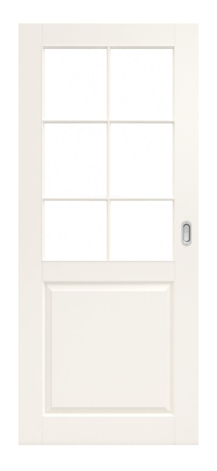 Model drzwi przesuwnych imponuje drewnianą kasetą i otworem świetlnym. Na szkle umieszczone są delikatne szprosy, które subtelnie dzielą otwór świetlny na sześć elementów.