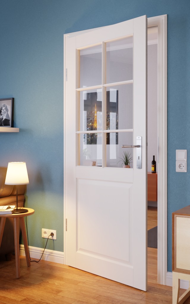 Wyposażone w wysokiej jakości białą lakierowaną powłokę, odpowiednia stabilność zapewnia pełne wypełnienie wewnętrzne. Wygląd drzwi z ozdobnym szkłem delikatnie otacza przestronny szklany wstaw z nałożonymi listwami szklanymi. Wąskie drewniane listwy nadają drzwiom wewnętrznym wyjątkowy charakter.