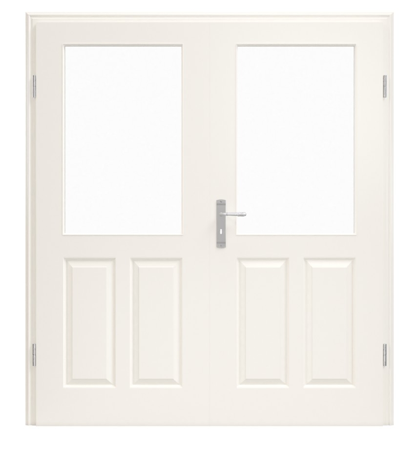 Te wysokiej jakości białe lakierowane drzwi podwójne serii Stiba Plus od Jeld-Wen (w kolorze podobnym do RAL 9010 lub podobnym do RAL 9016) przekształcają Twój dom w klasycznie urokliwe otoczenie z elegancką finezją.